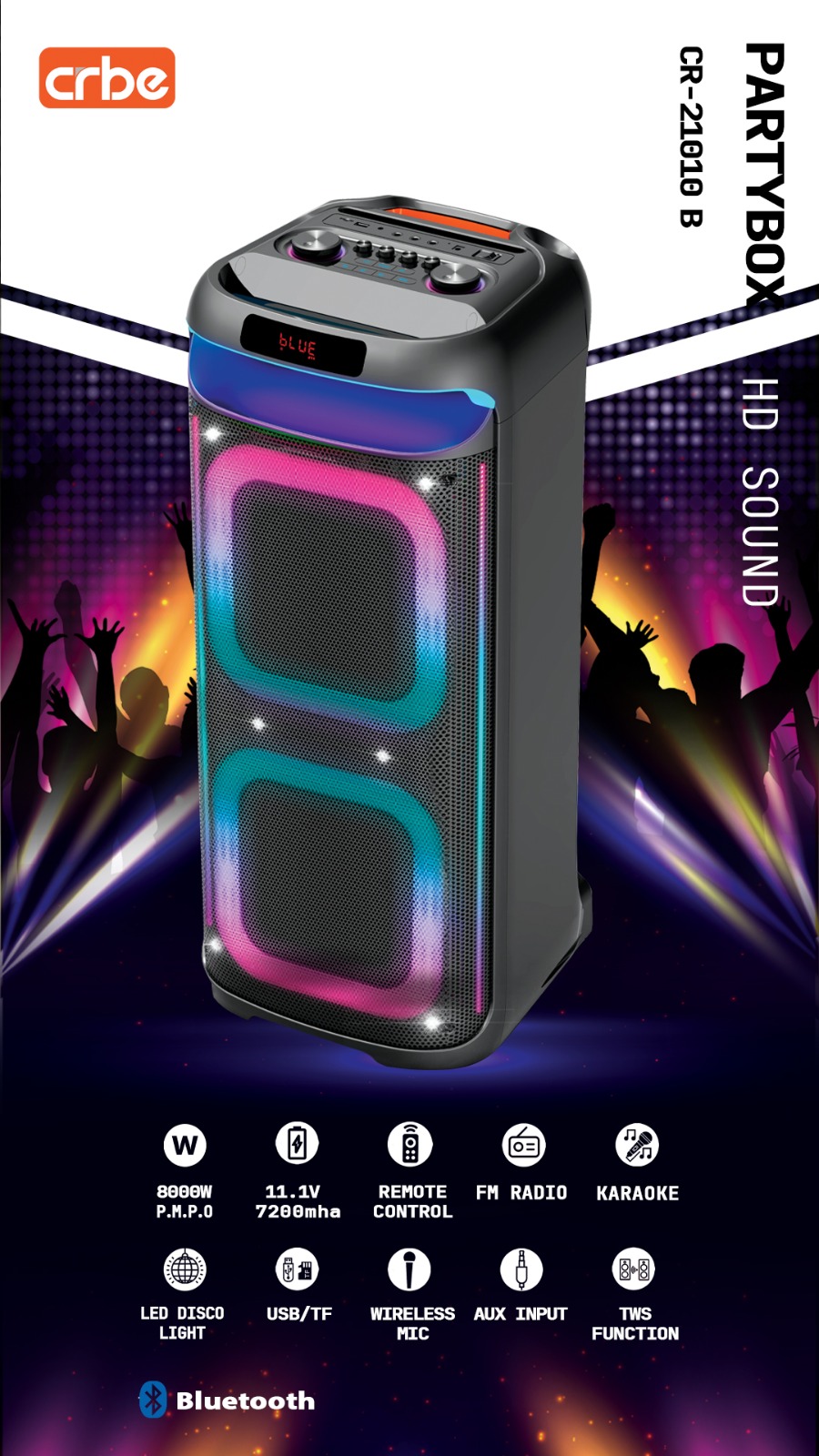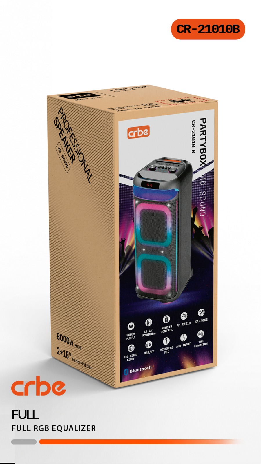 اسپیکر CRBE CR-21010B Party Box یک اسپیکر قابل حمل با صدای قدرتمند و شفاف است که برای مهمانیها و فضای باز طراحی شده است. با بلوتوث، USB، کارت حافظه و AUX، موسیقی را از منابع مختلف پخش میکند و باتری داخلی امکان پخش طولانی مدت موسیقی را فراهم میآورد.
