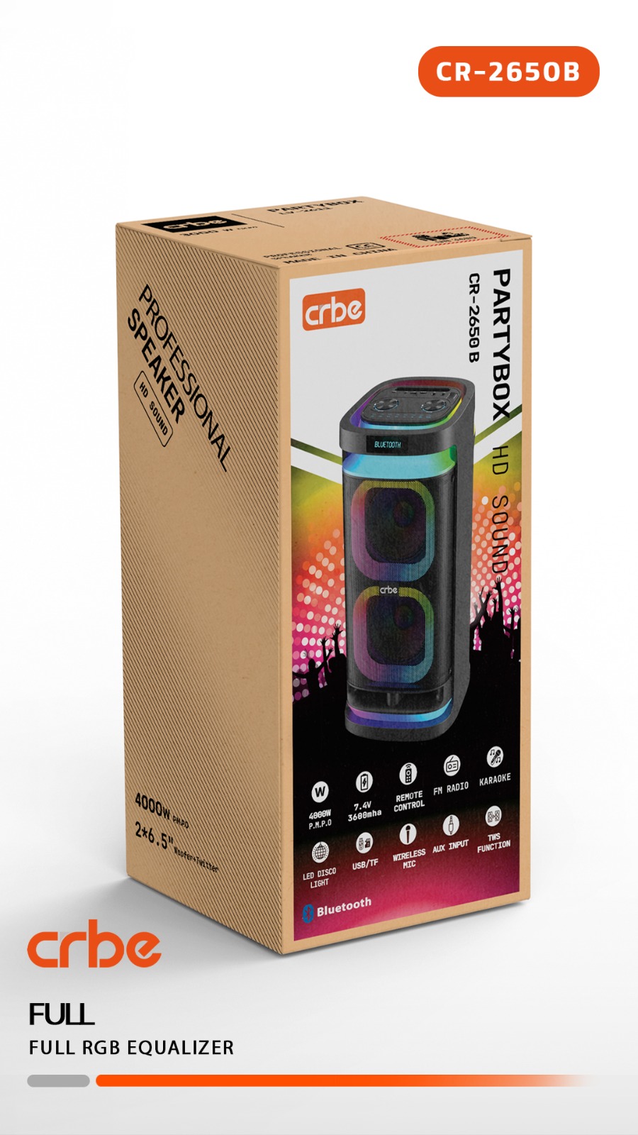 اسپیکر CRBE CR-2650B با صدای قدرتمند، طراحی مدرن و قابلیتهای چندمنظوره، گزینهای ایدهآل برای علاقهمندان به موسیقی و برگزاری مهمانیهای پرانرژی است.