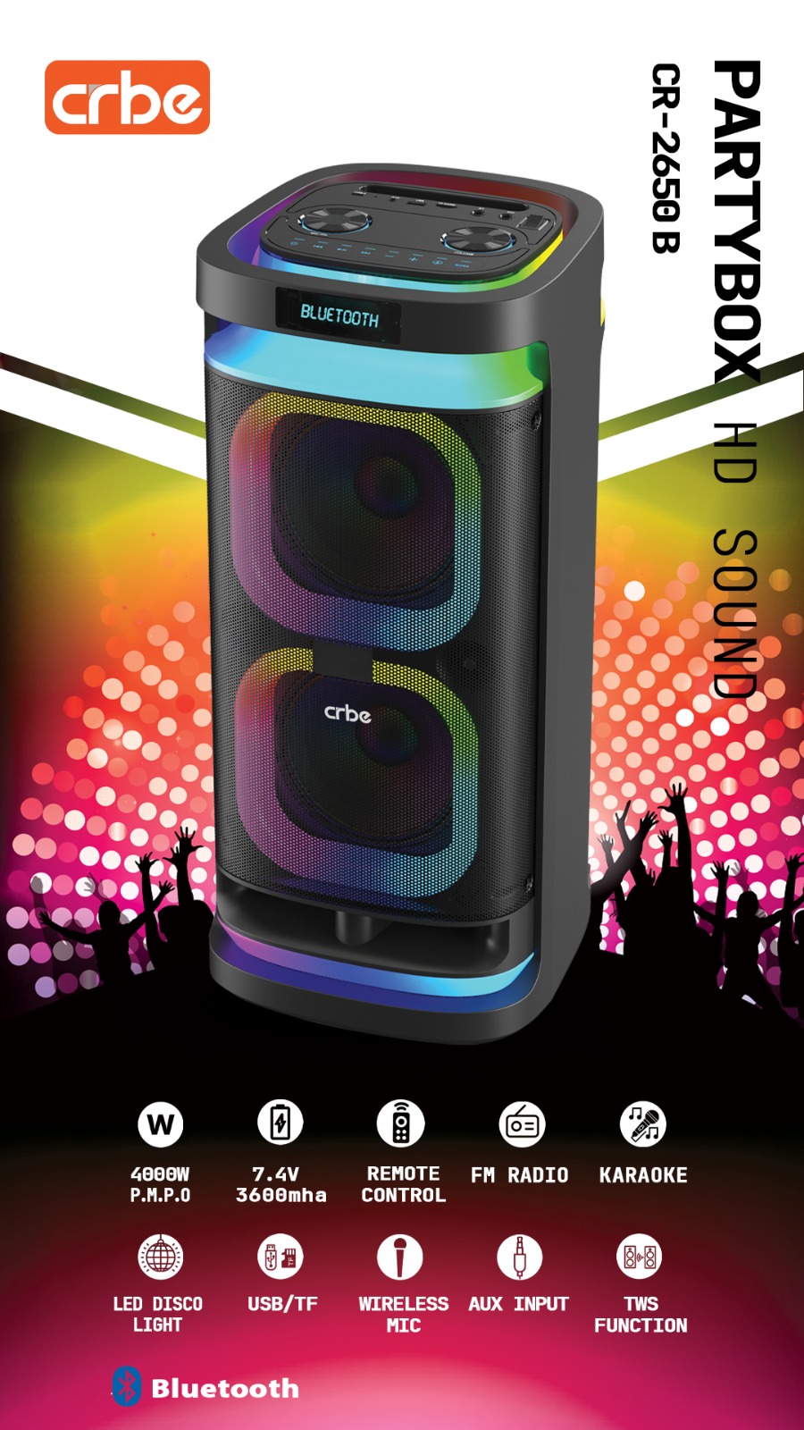 اسپیکر CRBE CR-2650B Party Box یک اسپیکر قابل حمل با صدای قدرتمند و شفاف است که برای مهمانیها و فضای باز مناسب است. با بلوتوث، USB، کارت حافظه و AUX، موسیقی را از منابع مختلف پخش میکند و باتری داخلی امکان پخش طولانی مدت موسیقی را فراهم میآورد.