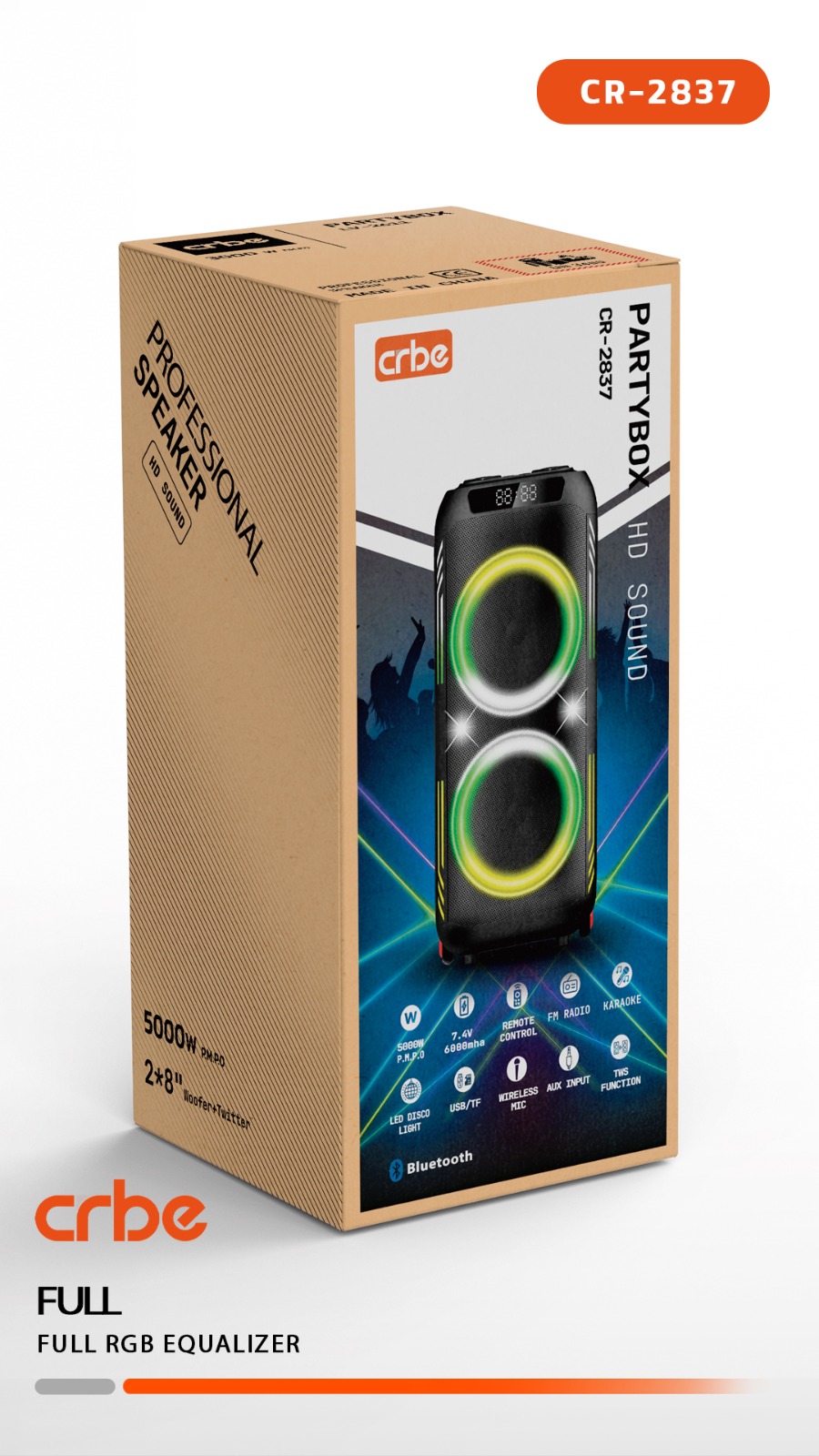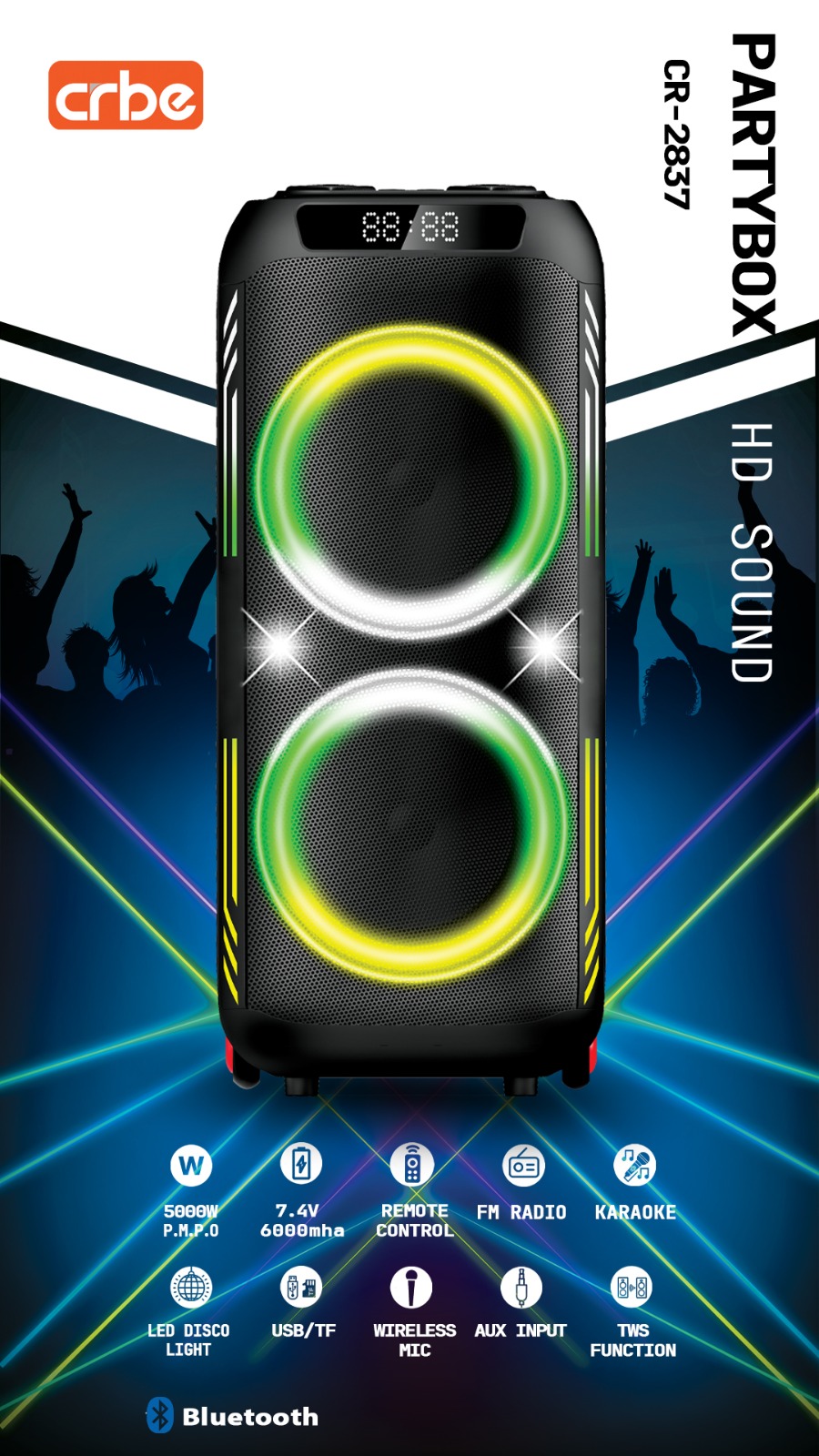 اسپیکر CRBE CR-2837 Partybox با طراحی جذاب و نورپردازی LED، یک گزینه ایدهآل برای جشنها، مهمانیها و استفاده در فضای باز است.