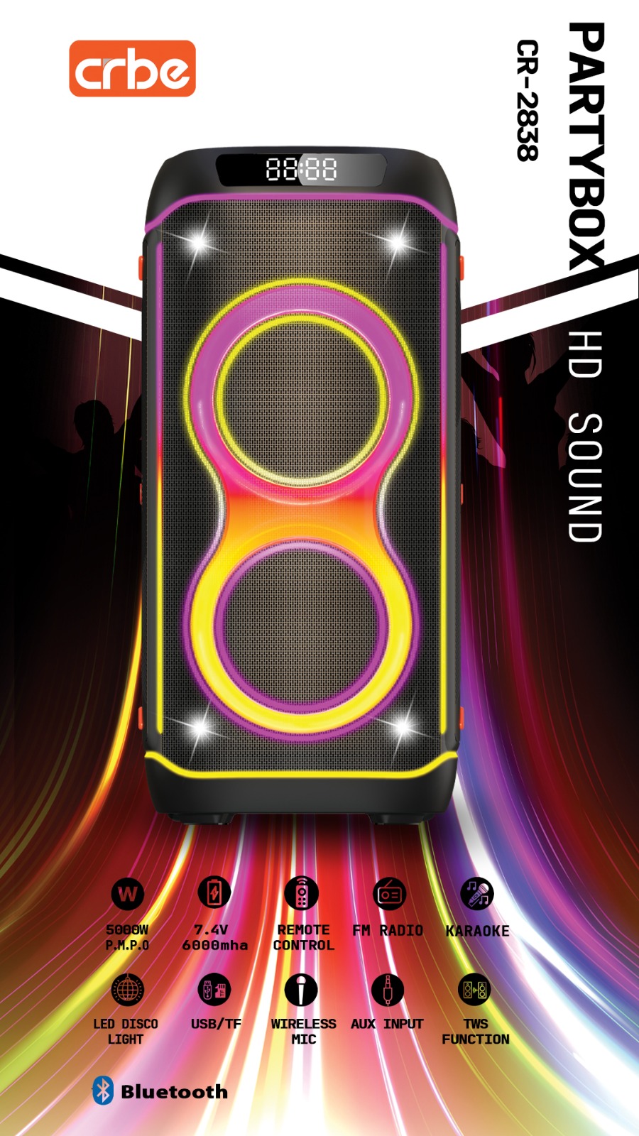 اسپیکر CRBE CR-2838 با صدای قدرتمند، امکانات چندمنظوره و طراحی جمعوجور، گزینهای ایدهآل برای علاقهمندان به موسیقی و برگزاری مهمانیهای پرانرژی است.