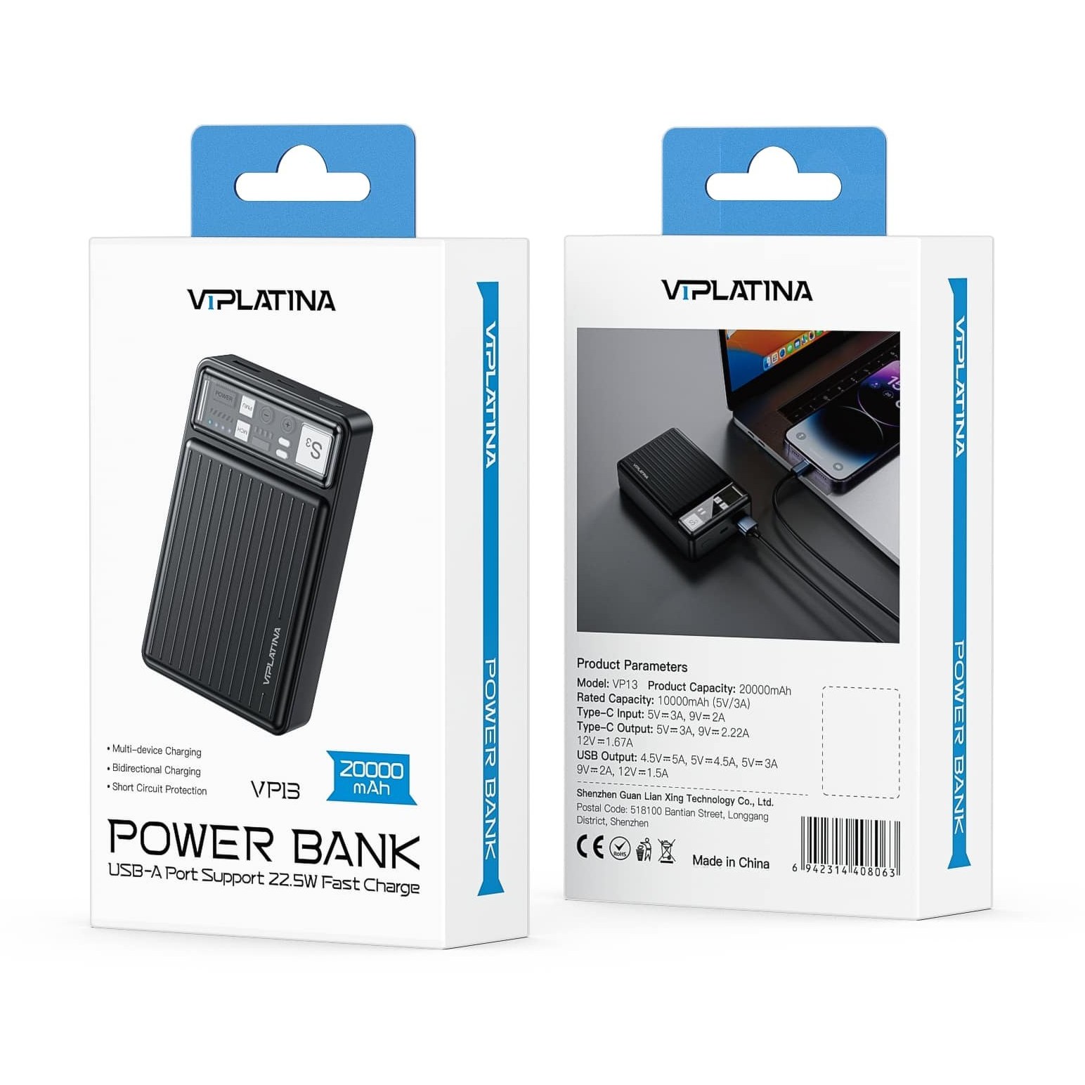 پاوربانک VIPLATINA VP13 با ظرفیت 20000 میلیآمپر ساعت، یک همراه مطمئن برای شارژ انواع گوشیهای هوشمند، تبلت و دیگر دستگاههای دیجیتال است. این محصول با داشتن پورتهای Type-C و USB، امکان شارژ همزمان چند دستگاه را فراهم میکند.
