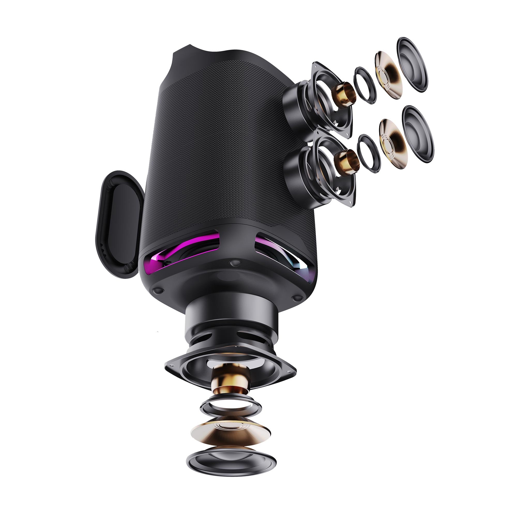 یکی دیگر از ویژگیهای جذاب این اسپیکر، نورپردازی LED داخلی آن است که همگام با موسیقی تغییر میکند و به فضای شما جلوهای خاص میبخشد. این قابلیت به ویژه در مهمانیهای شبانه، هیجان و انرژی بیشتری به محیط اضافه میکند. در عین حال، اگر بخواهید عمر باتری را افزایش دهید، میتوانید نورها را خاموش کنید.