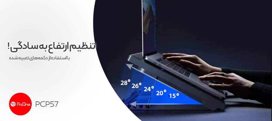 با PCP57 میتوانید لپتاپ خود را در زاویهای مناسب قرار دهید؛ پایه تاشو با قابلیت تنظیم شیب، تایپ و کار با لپتاپ را راحتتر میکند. همچنین این پایه خنککننده دارای دو پورت USB برای اتصال همزمان سایر لوازم جانبی است و با اکثر لپتاپها از ۱۰ تا ۱۷.۳ اینچ سازگار است.