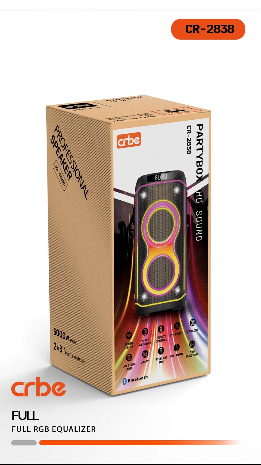 اسپیکر CRBE CR-2838 Party Box یک اسپیکر قابل حمل با صدای قدرتمند است که برای مهمانیها و فضای باز طراحی شده است. با بلوتوث، USB، کارت حافظه و AUX، موسیقی را از منابع مختلف پخش میکند و باتری داخلی امکان پخش طولانی مدت را فراهم میآورد.