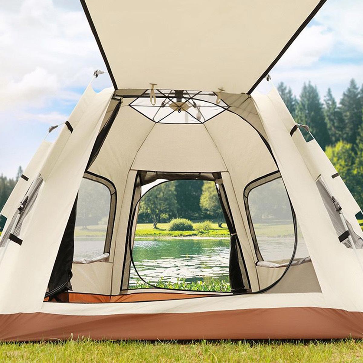 چادر کمپینگ اتوماتیک Hiska H-30 یکی از گزینههای بینظیر برای ماجراجویان و طبیعتگردانی است که به فضای بزرگ، مقاومت بالا و سهولت در استفاده اهمیت میدهند. طراحی ششضلعی دولایهی این چادر با ابعاد 160 در 240 در 280 سانتیمتر فضای کافی برای اقامت ۵ تا ۸ نفر را فراهم میکند. این طراحی هوشمند علاوهبر ایجاد فضای داخلی وسیعتر، باعث افزایش پایداری چادر در برابر باد شده و آن را برای استفاده در شرایط آبوهوایی مختلف مناسب میسازد. وجود دو لایهی مجزا در این چادر، عملکرد بسیار خوبی در تهویه هوا و عایقسازی حرارتی دارد؛ لایهی بیرونی از شما در برابر باد، باران و نور خورشید محافظت میکند و لایهی داخلی باعث گردش مناسب هوا شده و مانع از ایجاد رطوبت میشود.