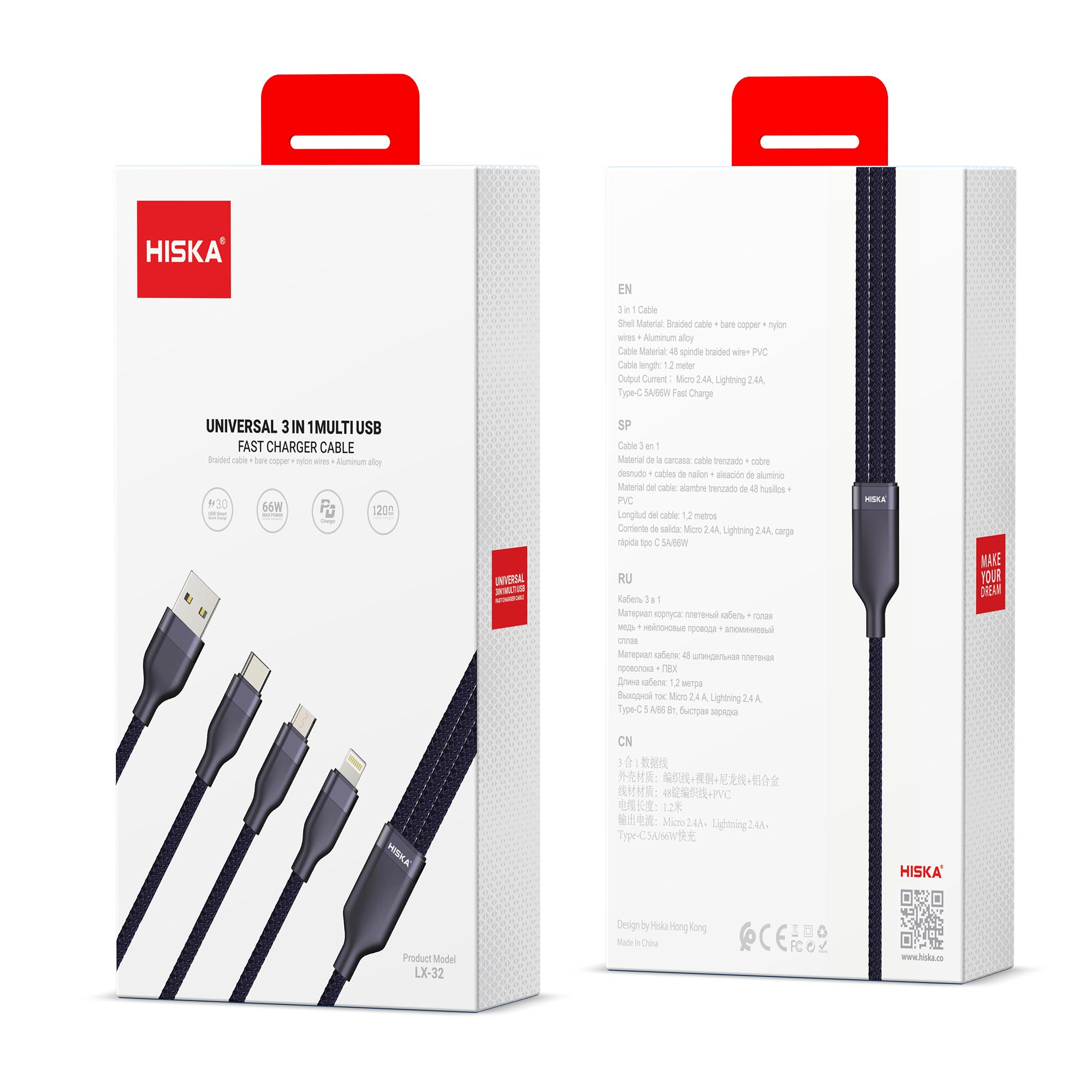 نوع اتصال 3 به 1: کابل شارژر هیسکا مدل LX-32 از طراحی اتصال 3 به 1 بهره میبرد که شامل کانکتورهای Type-C، Lightning، و Micro USB است.