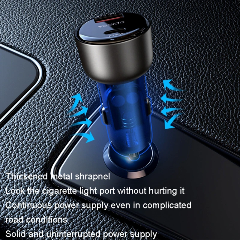 مدل «Y52» از سری شارژرهای اتومبیل «Yesido» با توان 38 وات طراحی و تولید شده است. با کمک این شارژر میتوانید باتری دو تلفن ، تبلت یا لپ تاپ خود را با بیشترین سرعت و تا چند برابر سریعتر از شارژر های معمولی شارژ کرده و در وقتتان صرفهجویی کنید. روی بدنه این شارژر، دو درگاه خروجی USB-A و USB-C وجود دارد. شدت جریان ورودی این شارژر برای 18 USB-A وات و برای USB-C 30 وات بوده و شدت جریان خروجی آن 5 / 9 / 12 ولت است. این محصول تنها 43 گرم وزن دارد. برای استفاده از این شارژر اتومبیل، کافی است آن را بطور مستقیم به درگاه فندک داخل ماشین وصل کرده و سپس دستگاه موردنظرتان را با استفاده از یک کابل USB-A و یا USB-C به شارژر متصل کنید. «Y52» دارای تکنولوژی Quick Charge 3.0 و فناوری PD USB-C برای ارائه بهترین شارژ برای هر دستگاه است. اگر به دنبال یک شارژر اتومبیل باکیفیت همراه با طراحی زیبا، فشرده، باریک و جمعوجور هستید که با استفاده از آن امکان شارژ باتری دو دستگاه مختلف را به طور همزمان داشته باشید، این مدل از شارژرهای یسیدو انتخاب بسیار مناسبی خواهد بود.